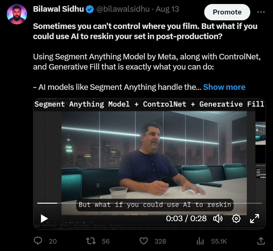 Since this interview was recorded in a rather ordinary LA convention center, I took the liberty of using Segment Anything + ControlNet to transport us to a more fitting environment. It's something you've got to see! I’m suprised with how well it held up for a 30 min video. Rotobrush, stand aside SAM is in town!