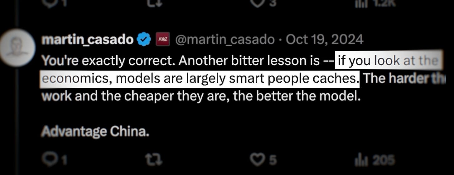 On top of that, China has film students doing dense video labeling — people who can describe scenes with actual cinematic vocabulary. That produces fundamentally better training data than more engineering-first annotation used by other labs. As Martin Casado posted, “Models are largely smart people caches. The harder the people work and the cheaper they are, the better the model.”
